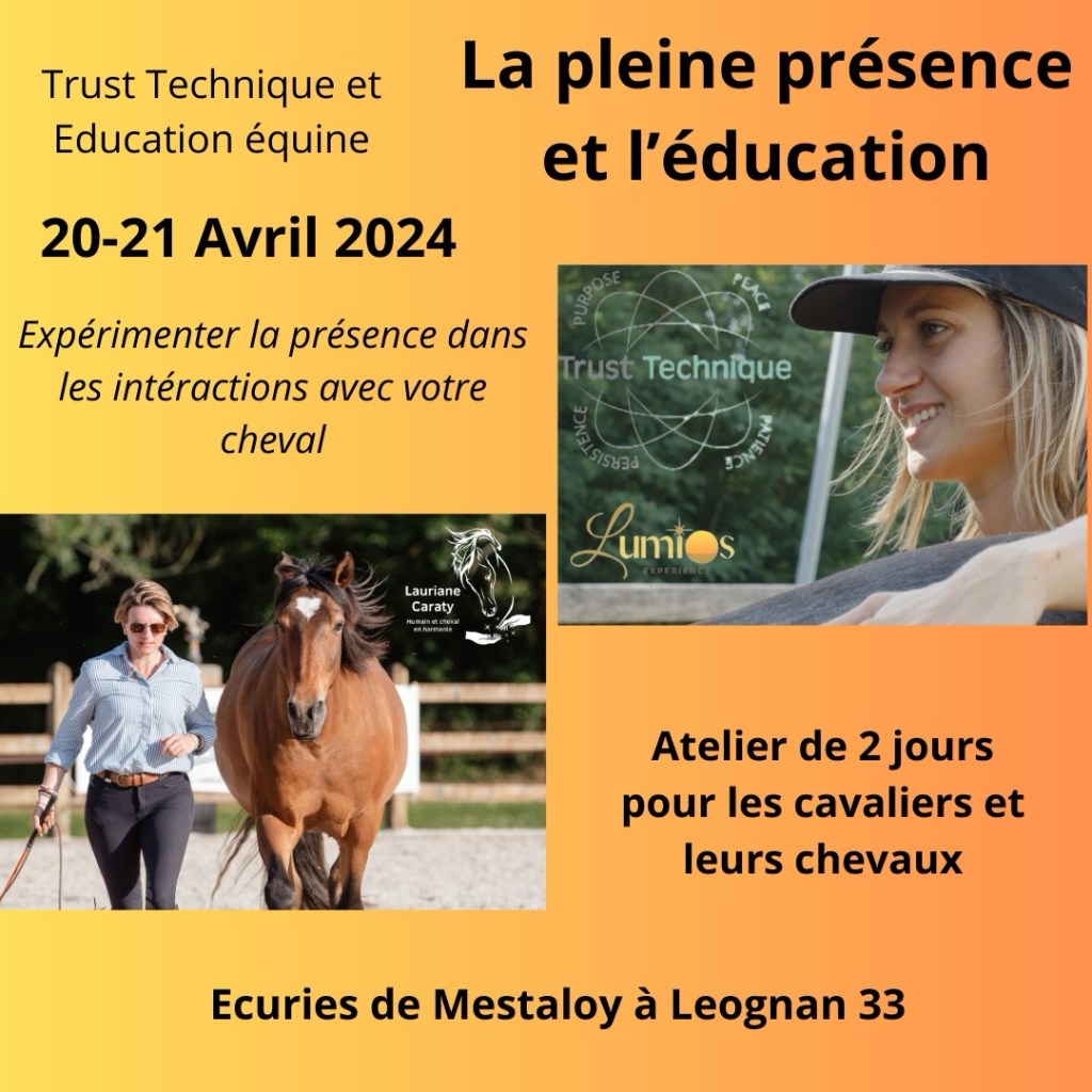 DĂ©couvrez lors de cet atelier la trust technique et sa pratique, au service du parcours d’apprentissage de l’humain et du cheval ensemble, en coopĂ©ration consciente.