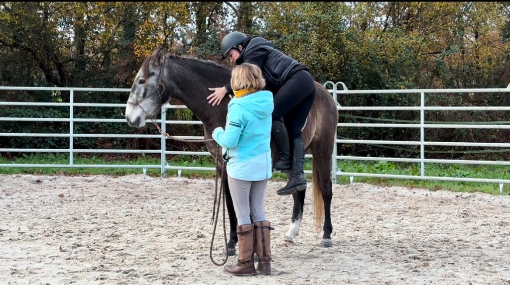 Comme ici sur le montoir, oĂč le cheval nâest pas totalement Ă lâaise. Du coup, il serait prĂ©judiciable dâaller plus loin sur cette sĂ©ance.